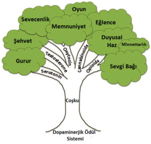 Shiota ve arkadaşları, bütün pozitif duyguların ortak bir atadan geldiğini iddia etmekte,. Bu genel ödül sisteminin atalarımıza arzu ettikleri yiyecekleri kovalamalarında da (dinozor çağından önce bile) yardımcı olduğu evrimsel bilim dalları tarafından sıkça bahsedilen bir konu.